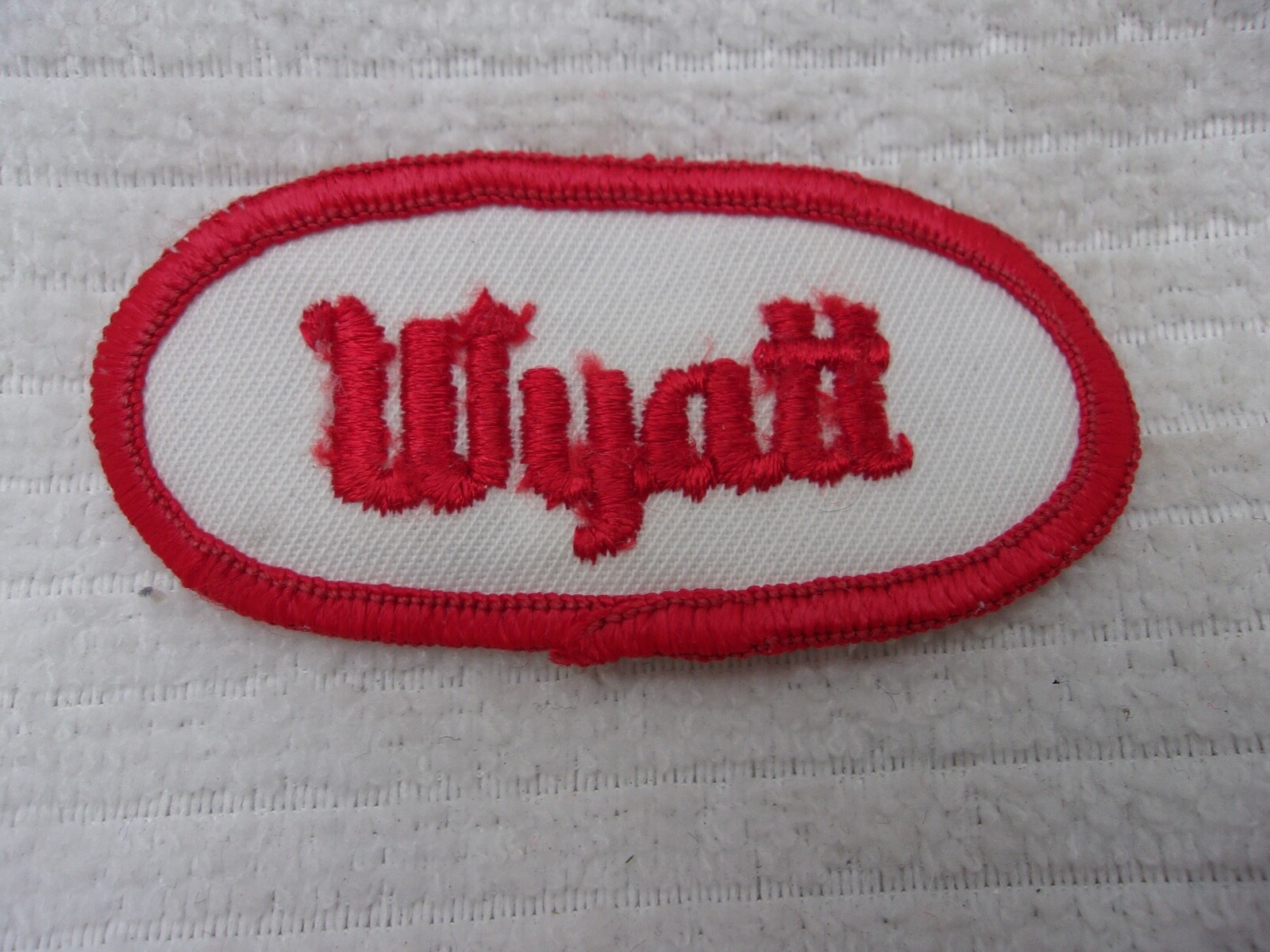 Wyatt Used Embroidered Sew On Name Patch Tag Oval Red On White Ebay